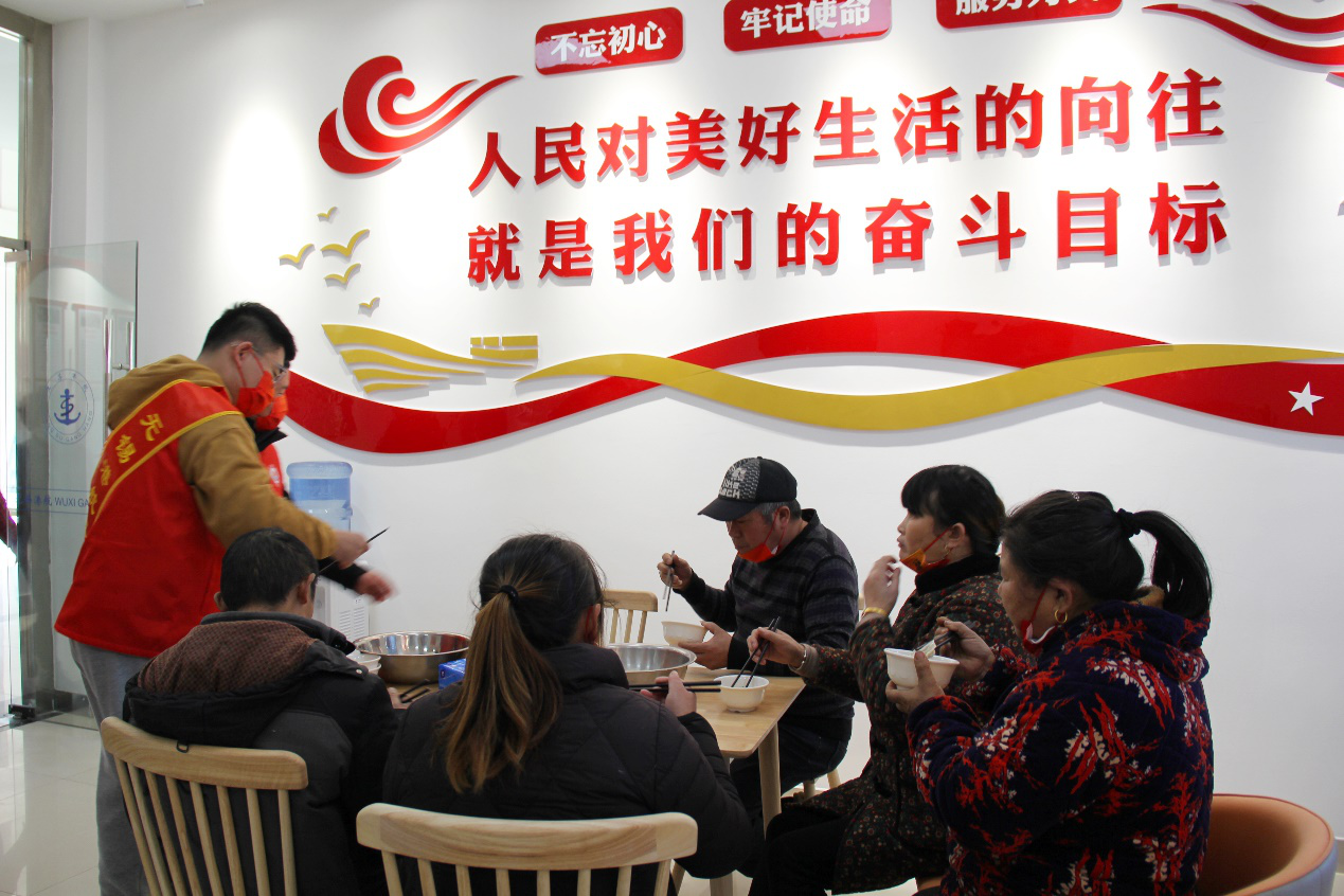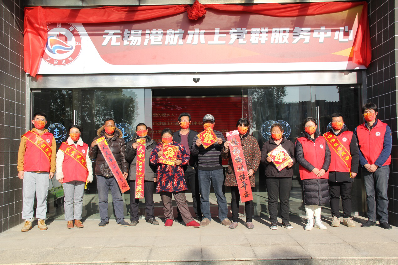 志愿者们登上船头,向船民们赠送春联、福字以及个人防护品,并与船民一起张贴春联与福字。大红的春联与金灿灿的福字装点了船舱,营造出红火喜庆的的新春氛围。在无锡港航水上党群服务中心的“船员之家”,志愿者们为在此休憩的船民送上了热气腾腾的饺子,香气扑鼻的饺子为船民的忙碌生活增添了欢乐祥和的年味。
