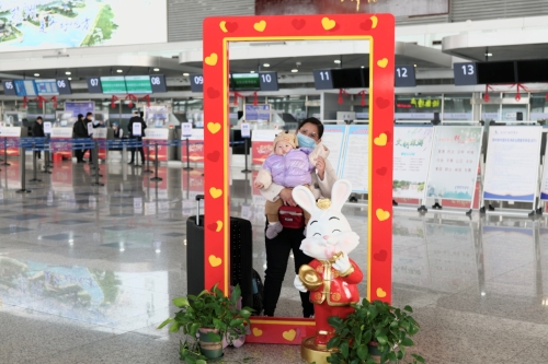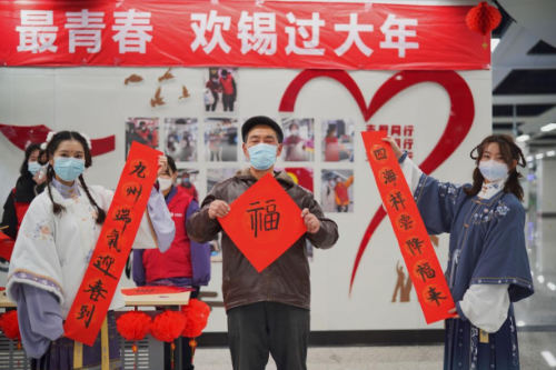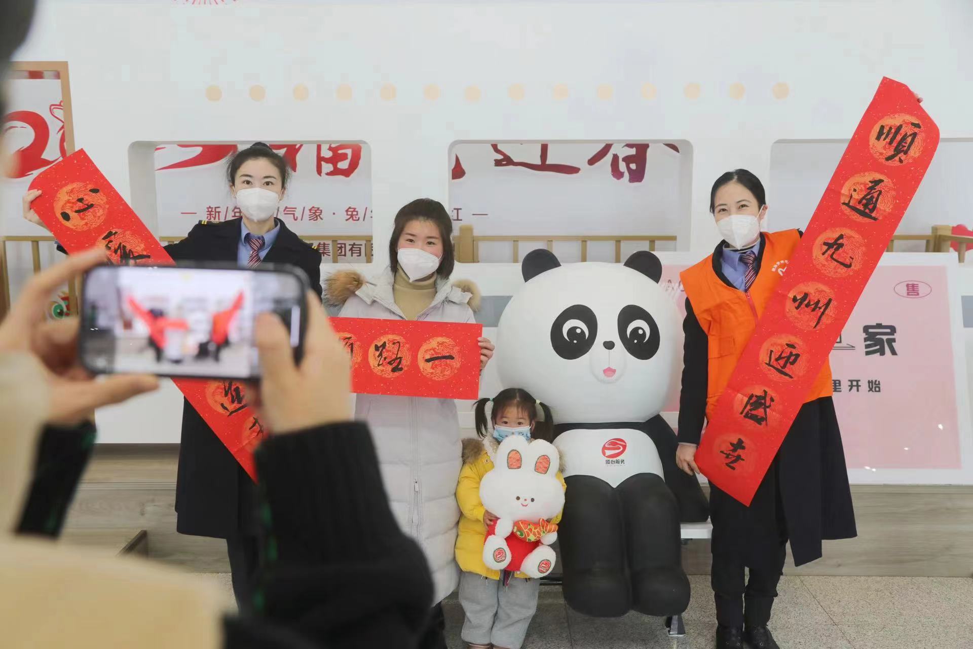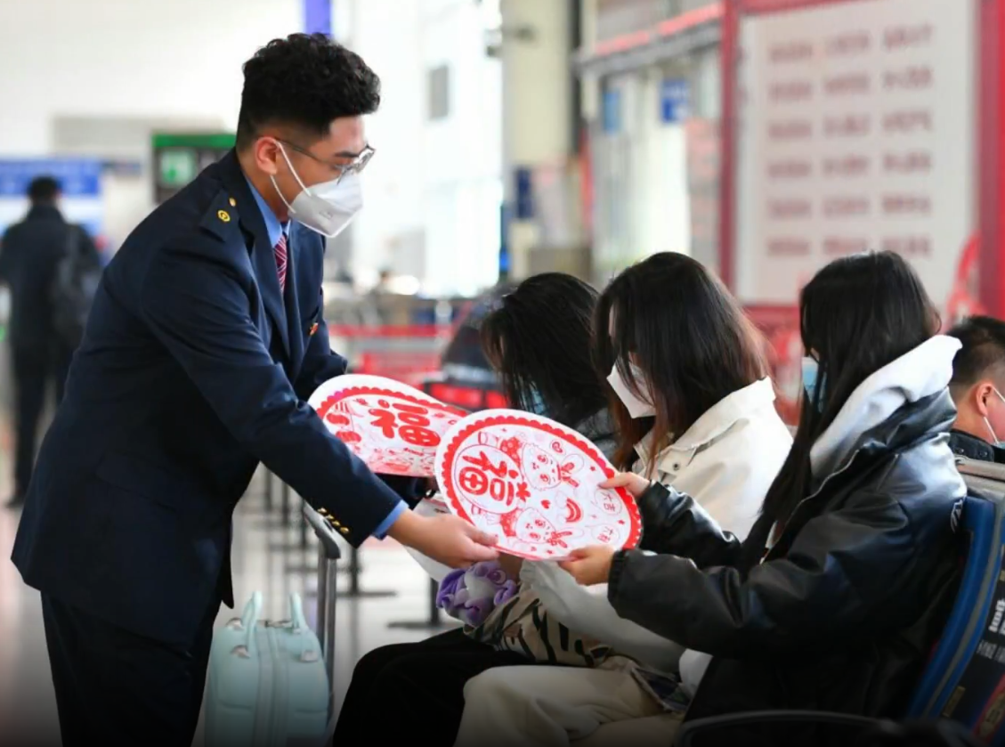 高铁徐州站组织工作人员在候车大厅向旅客赠送对联、“福”字和兔子玩偶,温暖旅客返乡路。