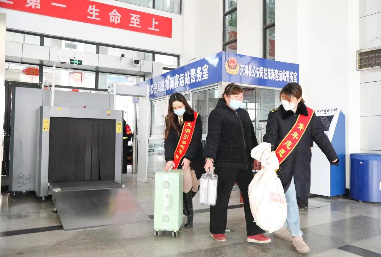 7日一大早,连云港市东海县汽车客运总站大厅内,客运工作人员热心地帮忙拎行李,并提醒乘客戴好口罩,做好个人健康防护,叮嘱乘客注意安全。该站出台了春运平安健康出行指南,对车站各重点场所进行按时消毒通风,努力做好乘客健康和安全保护。