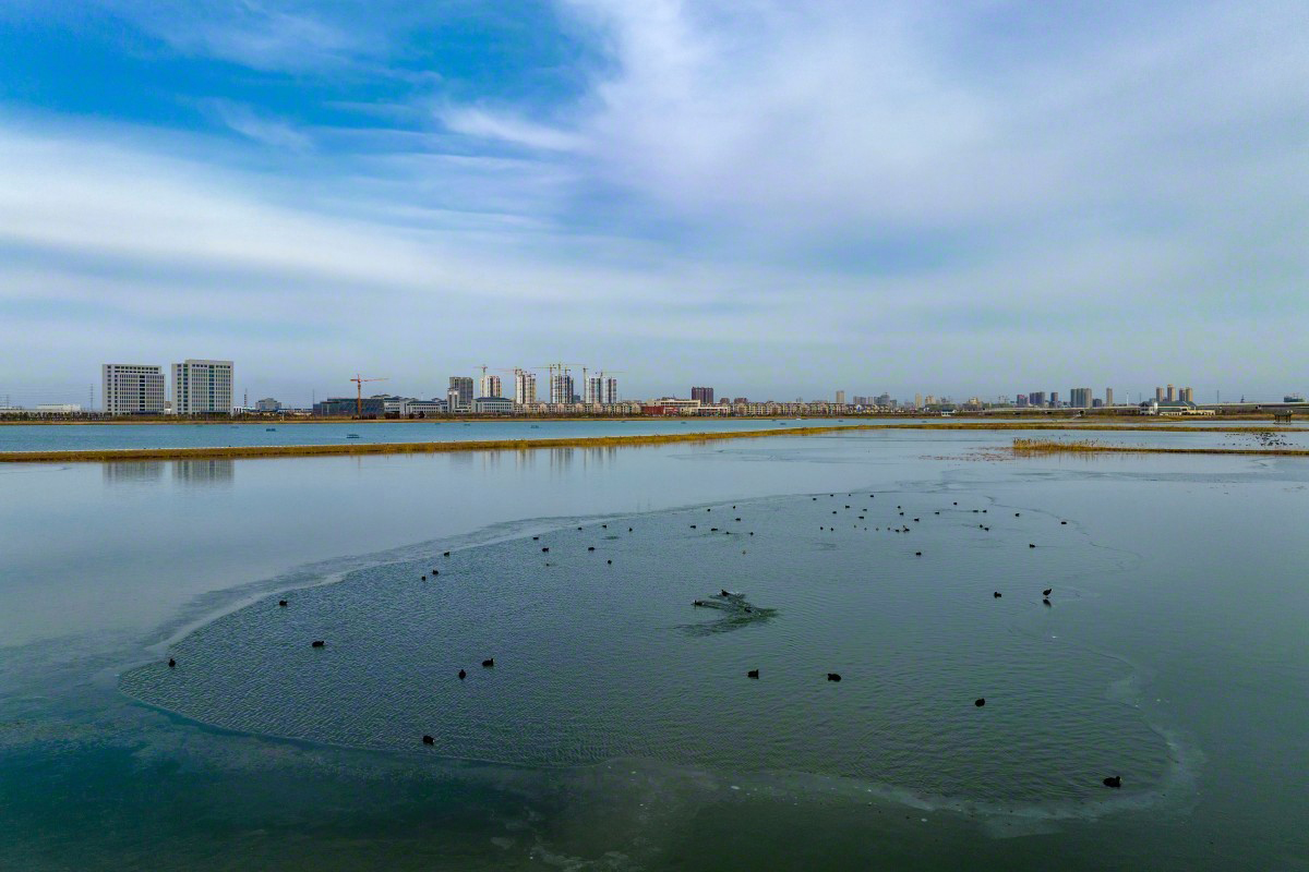2023年1月25日,成群的野鸭在淮安市涟水湖湿地中觅食栖息。淮安市涟水县因地制宜,在盐河畔打造占地2.4平方公里的人与自然和谐共...