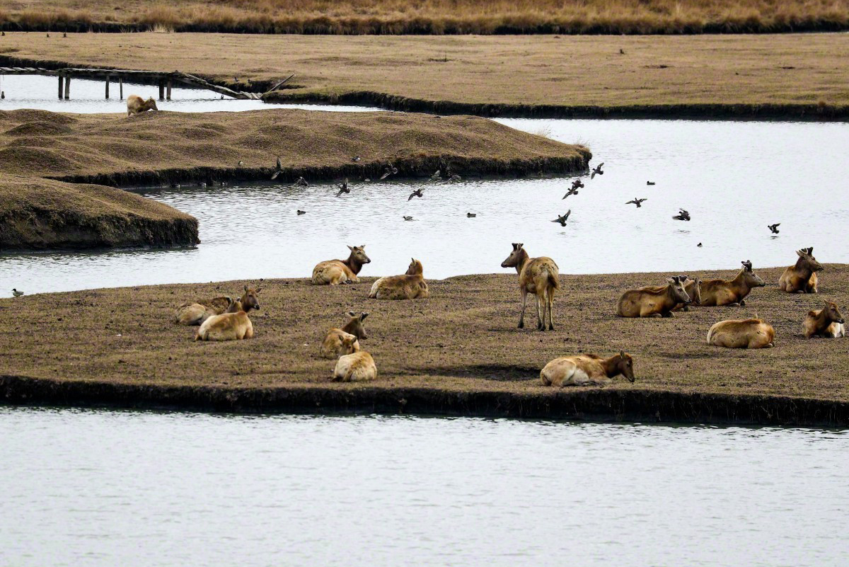 2023年2月2日是世界湿地日,泰州市姜堰区,麋鹿群在溱湖国家湿地公园内活动,湿地景如画。