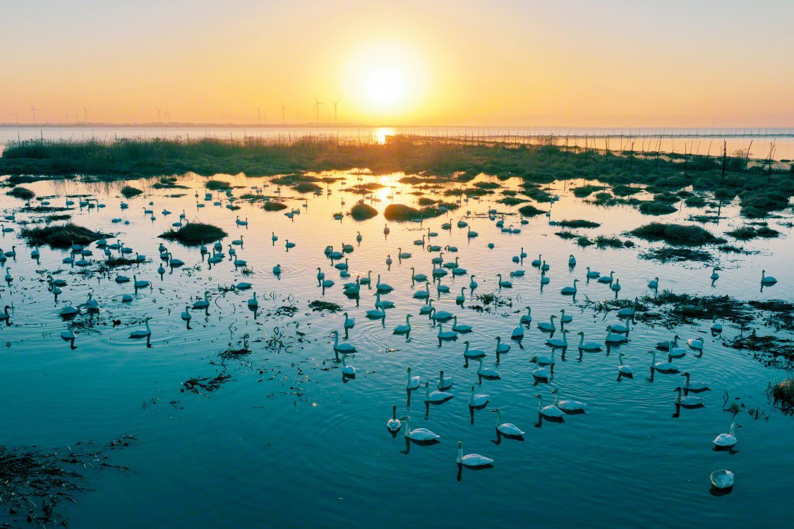 2023年1月11日,盱眙县,成群的天鹅在七里湖湿地觅食栖息。盱眙县位于淮河下游,有着良好的生态环境和丰富的湿地资源,吸引候鸟前来...