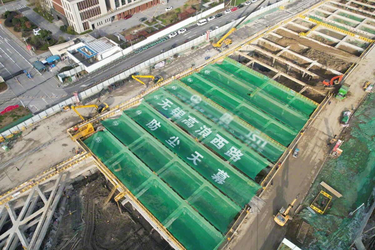 2023年1月6日航拍无锡高浪西路快速化改造工程主线隧道基坑安装上“防尘天幕”。“天幕”由钢构架系统、轮滑组系统、数控机电系统、钢...